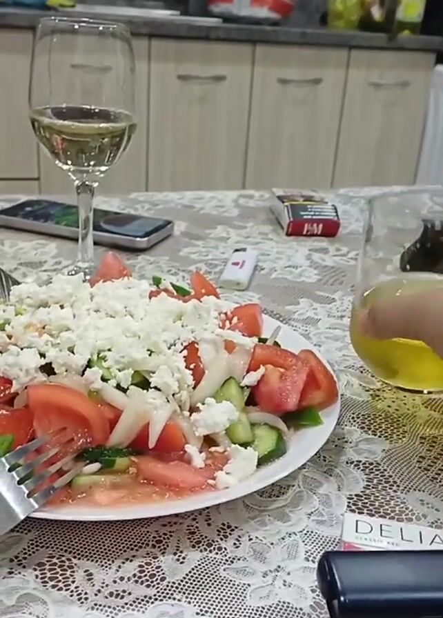 Here's a detailed description of the video: The video shows a table set for a meal. On the table is a plate of salad, consisting of tomatoes, cucumbers, onions, and feta cheese. A fork is partially inserted into the salad. There are two glasses of white wine on the table, one a standard wine glass and the other a short tumbler. In the opening of the video, a hand holding the tumbler lifts it slightly and tilts it, as if inspecting the contents before setting it back down. Other items on the table include a smartphone, two packs of cigarettes (one partially visible), and a lighter. The tablecloth is a white lace pattern. In the background, the kitchen area is visible. It features light-colored cabinets and a gray countertop. A red and white bag is on the countertop, along with other miscellaneous items. The overall lighting appears to be from an overhead light source. The background music is audible.
