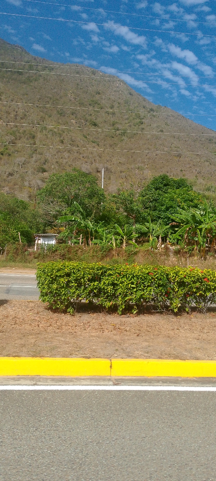 The image depicts a roadside scene in La Asuncion, Venezuela, under a clear blue sky with scattered white stratocumulus clouds. In the immediate foreground, a grey asphalt road surface is visible, marked by a solid white line painted along its right edge. Adjacent to this line is a bright yellow-painted concrete curb. Beyond the curb lies a strip of dry, light brown earth, followed by a dense, trimmed green hedge, approximately 1 meter high, exhibiting small red floral clusters. Behind the hedge, a paved two-lane road section is partially visible. Further back, a vibrant green tropical landscape includes mature trees with full canopies and numerous banana plants. Nestled within this greenery, to the left of a tall white utility pole, a small, white, single-story structure with a dark roof is partially discernible. The background is dominated by a large, arid mountain slope, covered in sparse, dry, light brown vegetation and scattered cacti. Several thin, horizontal utility lines traverse the upper portion of the image, extending across the sky and mountain face. No individuals are present in the scene.