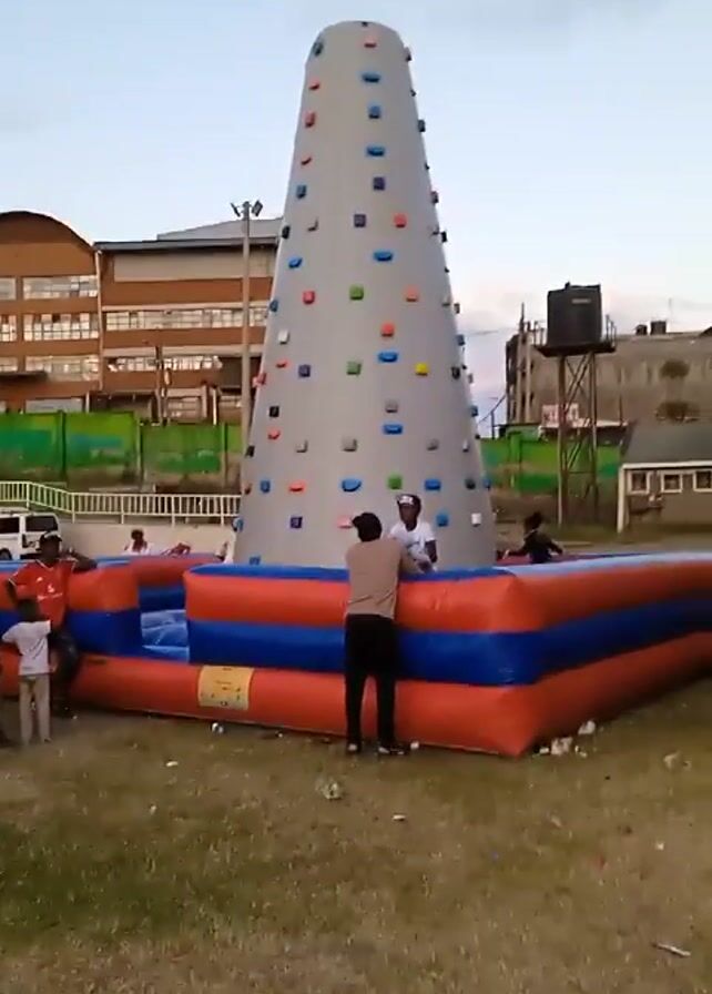 In the video, an inflatable rock-climbing wall is set up on a grassy field