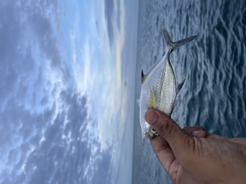 A human hand with a medium skin tone firmly grasps a small, silver-scaled fish against an open marine backdrop, located in the coastal waters near Lhokseumawe, Indonesia