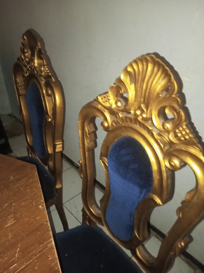 The image depicts an interior scene in Akola, India, featuring two ornate chairs positioned around a wooden table. The chairs are characterized by gilded, highly decorative frames with elaborate scrollwork and shell-like crests, upholstered in deep blue velvet on both the backrests and seats. The chair in the foreground on the right displays significant detail in its golden ornamentation. A light brown wooden table, exhibiting visible surface wear and scratches, occupies the lower-left foreground, partially obscuring the seat of the nearest chair and the lower portion of the second chair. The background consists of a plain, light-colored wall. A tiled floor with light-colored tiles and dark grout lines is visible beneath the furniture. No individuals or dynamic actions are present in the scene.