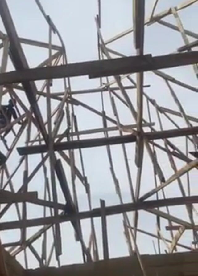 From a low angle, the video shows three construction workers building the wooden framework of a roof on a building