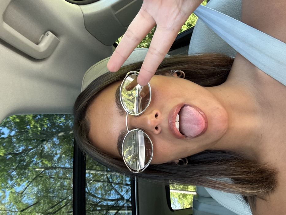 A close-up, selfie-style image depicts a young female inside a vehicle