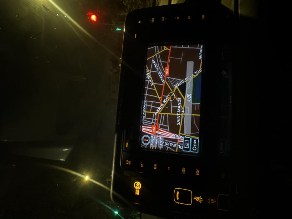 The image depicts a nighttime interior view from a vehicle, facing forward through the windshield. The central feature is a vehicle infotainment system displaying a navigation map. The map is centered on "SAINT-MANDÉ, France," clearly showing street names such as "RUE PLISSON," "AVENUE FOC," "AVENUE AUBERT," "BOULEVARD DE VANE," and "ROUTE DE LA TOU," along with routes "N34" and "D20." The GPS indicates a distance of "100yd" and shows active GPS and TMC services. The infotainment console features illuminated physical buttons for "MAP VOICE," "DEST," "MENU," "TEL," "AUDIO," and "MODE" on the left, and "TRACK," "VOL," and "PWR" on the right. Two yellow warning indicators are lit: one representing a passenger seatbelt or airbag status, and another circular symbol, possibly for traction control. Through the windshield, a green traffic light is visible to the left, and a red traffic light is visible to the right. Several yellow streetlights illuminate the dark exterior, casting reflections and light streaks on the windshield, indicating wetness or fog. Faint silhouettes of distant buildings are discernible against the dark sky. No individuals are visible in the scene.