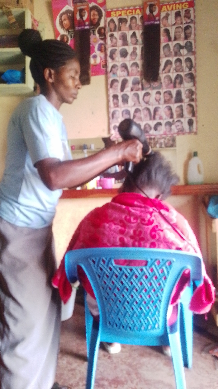 An interior shot in Siaya Township ward, Kenya, depicts a hair stylist actively blow-drying a client's hair