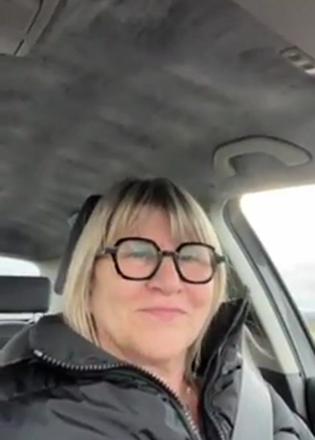 The video depicts a middle-aged woman with blonde hair, wearing glasses and a black puffer jacket, sitting in the driver's seat of a car