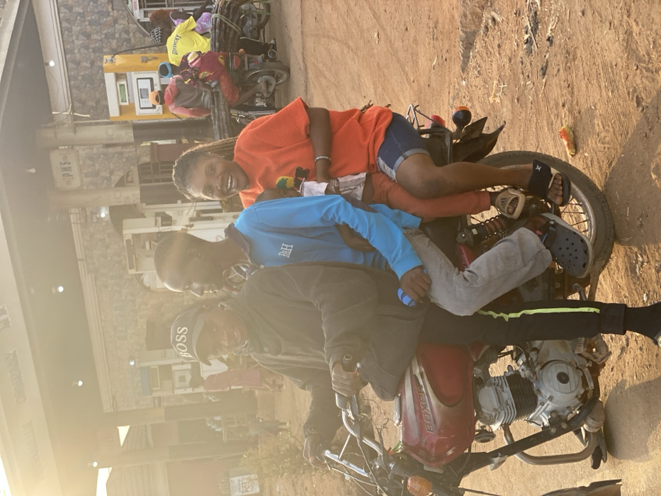 Three people are crowded onto a red motorcycle. The driver wears a black jacket and a "BOSS" hat. A young boy in a blue shirt sits behind him. A woman in an orange shirt lies horizontally across the back, smiling. They are positioned in front of a building, possibly a gas station, with visible gas pumps. The ground is dirt and the lighting suggests it's either early morning or late afternoon.