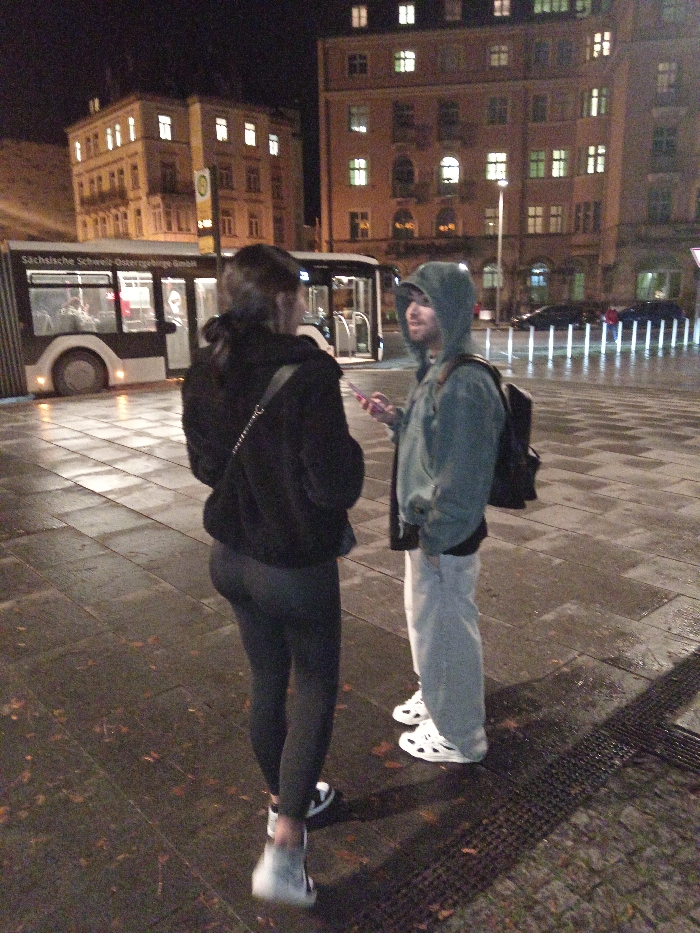 The image captures a night scene at the Wilsdruffer Straße / Postplatz intersection in Dresden, Germany, characterized by wet, rectangular-paved ground indicating recent precipitation. Two individuals are conversing in the foreground. A female, seen from the rear, wears a dark puffy jacket, dark leggings, and black and white athletic shoes, with dark hair tied back. She faces a male subject, visible in profile, wearing a teal/grey hooded sweatshirt, light grey sweatpants, and distinctive white athletic shoes with cutouts. He has a dark backpack on his shoulders and holds a pink/red smartphone in his left hand. In the mid-ground, a white and black regional bus, displaying "Sächsische Schweiz-Osterzgebirge GmbH" on its side, is stopped or parked, with illuminated interior windows revealing passengers. Behind the bus and to the right, multiple multi-story buildings with illuminated windows constitute the backdrop. A row of white, reflective bollards separates the pedestrian area from a street section where a dark vehicle is faintly visible in the distance. A bus stop pole is situated near the bus.