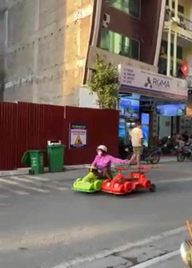 person riding a connected pair of small, plastic toy cars on a city street. One car is red, and the other is green. The person riding them is wearing a purple jacket and white face mask. They appear to be having fun, with their arms spread out. The scene is set on a paved road in an urban area, with buildings on either side. There's a red corrugated metal fence visible along the side of the road. A motorbike passes the person on the toy cars. In the foreground, on the right, is a wooden utensil holder, suggesting the video is taken from a restaurant or eating area.