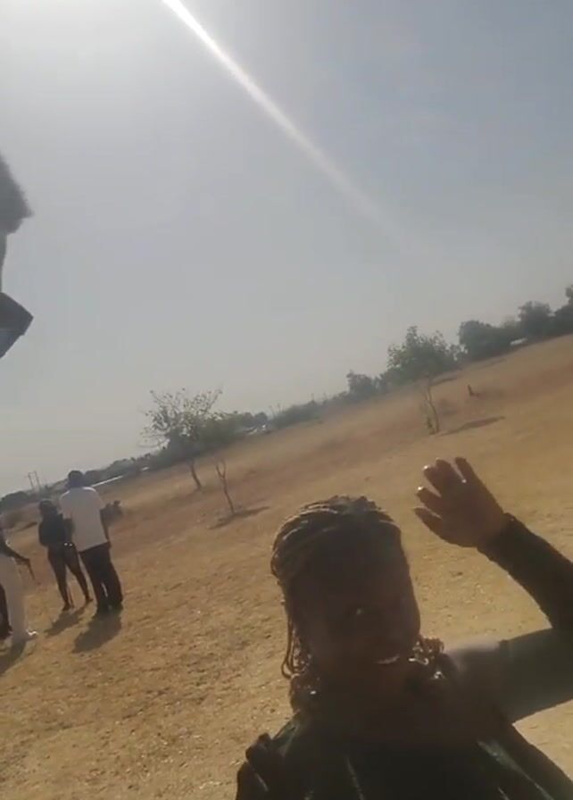 The video, filmed from a low angle on a sunny day, shows a Black woman with braids in a black outfit posing for the camera in a dry, grassy field. The sun is bright and high in the sky. In the background, several people are standing or walking around, including a man in a white shirt. A few sparse trees are scattered in the background. The woman smiles and waves at the camera.