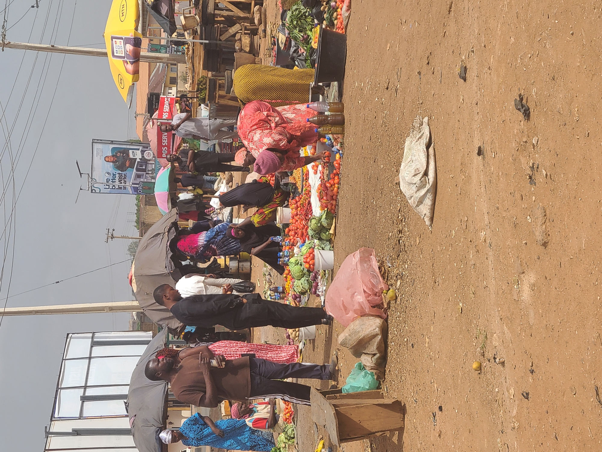 bustling market scene in Jos, Nigeria. People are gathered around stalls laden with fresh produce such as tomatoes, cabbages, and other vegetables. Many individuals are wearing traditional African attire. Umbrellas provide shade from the sun. The ground is brown and dusty. There are several advertisement signs with the texts "Live better. Invest smarter." and "POS service". There are utility poles and wires visible overhead. There are also several objects, including plastic bottles and bags, littering the ground.