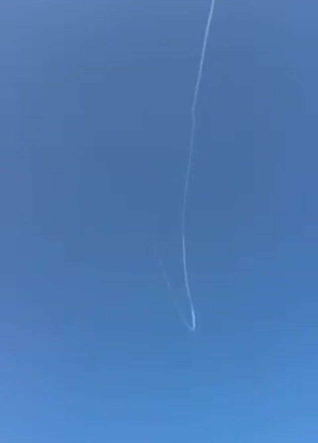 bright blue sky with a white vapor trail arcing downwards and then upwards into a straight line. A small, blurred object is visible to the left of the arc. The sky is clear and appears to be sunny.