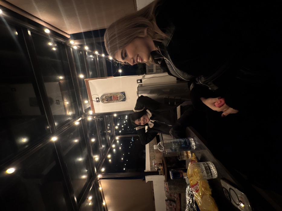 Two women are in an enclosed patio or outdoor room, possibly a bar. The taller woman with light blonde hair wears a black leather jacket and smiles. A shorter woman in a dark jacket with a light-colored lining rests her head on her hand. The room has a clear roof and walls lined with string lights. Water bottles, a glass, and snack bags are visible on a counter. A framed piece of art hangs on the wall in the background.