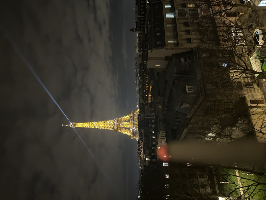 Nighttime cityscape featuring the illuminated Eiffel Tower with its searchlight piercing the dark, cloudy sky