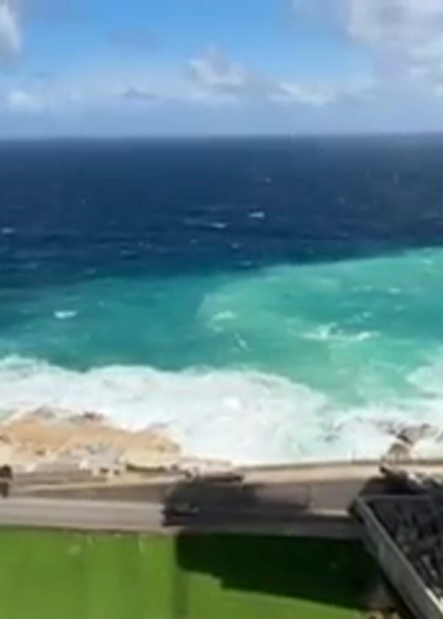 scenic view of a coastal area with a rough sea. The ocean stretches to the horizon under a partly cloudy sky, with a distinct color contrast between the deep blue of the open water and the turquoise closer to the shore where waves are crashing against the land. Adjacent to the sea is a strip of land that includes a green area, a road with a few cars, and what appears to be a construction site with heavy machinery. Dominating the right side of the frame is a tall, multi-story building that is under construction, as evidenced by the crane atop it. The overall impression is one of a construction project alongside a powerful, natural environment, with the turbulent sea being the primary focus.