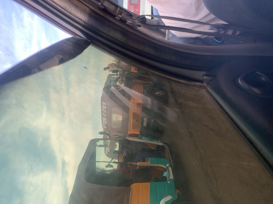 From inside a car, a row of auto-rickshaws is visible through the front window