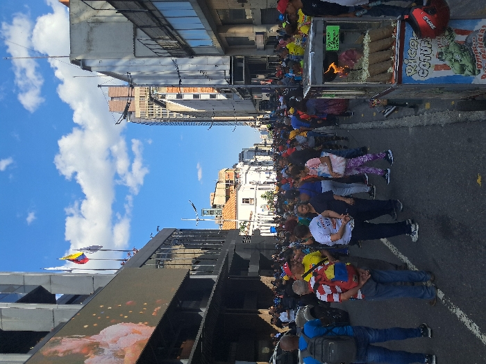 A crowd of people fills a city street lined with buildings, under a blue sky with scattered clouds. Many are dressed in bright colors, some in red, yellow, and blue, reminiscent of a flag. A food vendor's cart stands to the side, seemingly selling cooked food. The buildings are a mix of old and modern architecture, and flags flutter from one of the structures. The street appears to be packed, suggesting a rally or public gathering.
