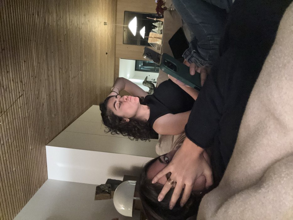 Two women are casually lounging indoors. One woman with curly hair lies with her head propped up by her hand, focused on a phone. The other woman is partially visible, covering her face with one hand, adorned with rings. A green phone case is prominent. Jeans are also visible near the top edge of the photo. A lamp sits in front of a white wall and what appears to be stone art. The background includes wood-paneled walls and a glimpse into another room.