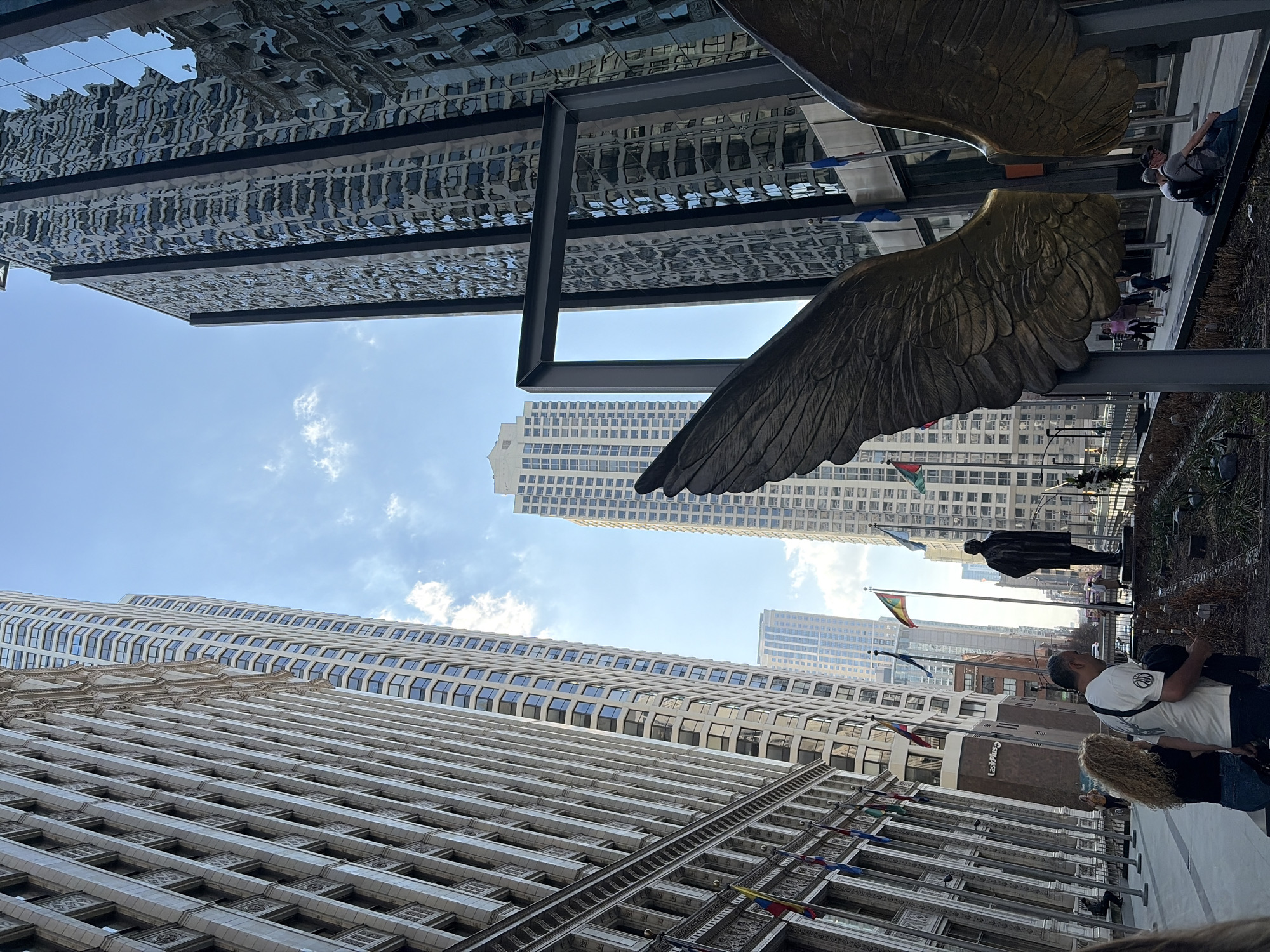 This is a low-angle shot of a street in Chicago, Illinois, United States. Buildings dominate the skyline, with architectural details visible on their facades. The Chicago Cultural Center is visible in the bottom-left of the frame, decorated with pennants. A monument or sculpture, appearing to be large, metallic wings, is in the upper right quadrant of the frame. People can be seen walking on the sidewalk. Flags from different nations are visible. The sky is partially visible between buildings, with a few clouds.