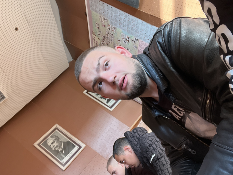 The image depicts an indoor scene, likely a public or educational building in the city of Kotel, Bulgaria. The primary subject is a young adult male with a short buzz-cut hairstyle and a dark beard, seen from the chest up. He wears a black leather jacket over a dark t-shirt with light-colored text, partially visible as "A & E". He looks towards the upper right of the frame with a slightly open mouth. A faint scar is visible above his left eyebrow. To his left, two other individuals are partially visible. The closer individual is a young male with short hair, seen in profile, wearing a dark puffer jacket with a repeating light-colored pattern (possibly a logo). He looks towards the left. The third individual is mostly obscured, with only a portion of their head visible. The background consists of plain brown walls. On the left wall, a framed black-and-white portrait of an older man with a prominent mustache is displayed; text below the portrait includes "Наум". Further to the right on the same wall, a second, smaller framed portrait is partially visible. On the far right wall, a large chart or map with Cyrillic text and numerous smaller images or squares is affixed; part of the visible text includes "ТУРЦИЯ РЕПУБЛИКА". The ceiling is white with perforated acoustic tiles, featuring a visible air vent and a small dark spot in the upper center.