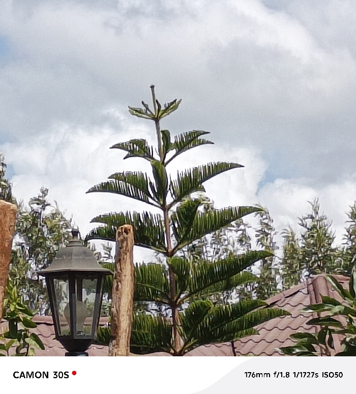 A partly cloudy sky backdrops a scene featuring greenery and constructed elements. A pine tree-like plant stands prominently in the center, with smaller trees visible in the background. To the left, a classic lantern fixture sits atop a post. A weathered wooden post stands next to it. Brown tiled roofs are partially visible beneath the foliage. The lower part of the image includes camera information with "CAMON 30S" on the left and lens details on the right.