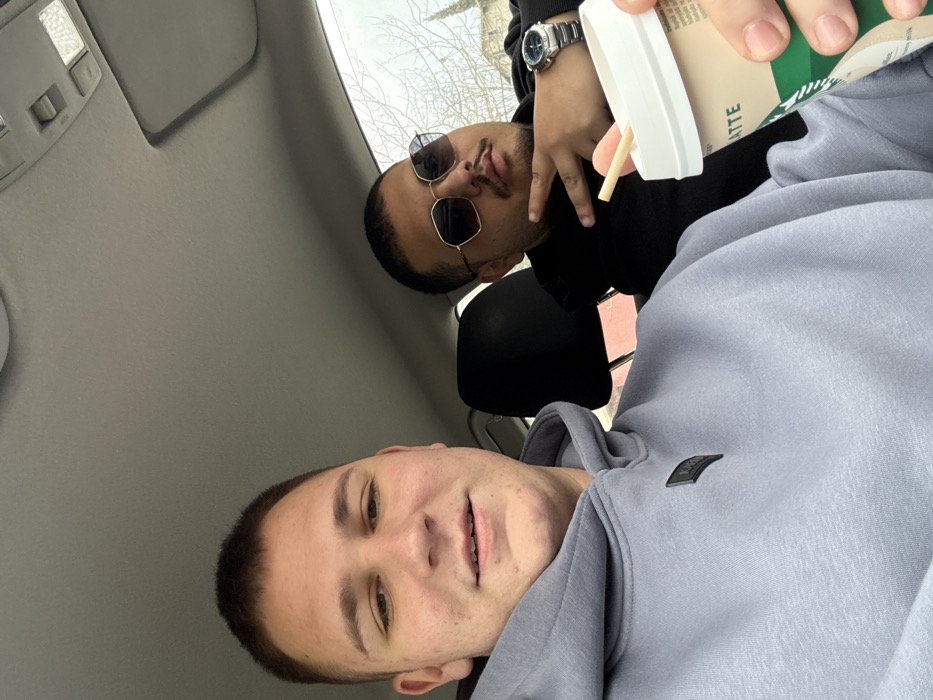 Two males are present inside a vehicle. The specific location within Stara Zagora, Bulgaria, cannot be identified from the visible elements in the image. The male in the foreground, positioned to the left, has a light skin tone and a short, buzz-cut hairstyle. He wears a light grey hooded sweatshirt with a small, dark, rectangular patch on the chest. His expression is neutral as he looks towards the camera. The male in the background, positioned to the right, has a darker skin tone, short dark hair, and a mustache. He wears dark, hexagonal-framed sunglasses and a dark long-sleeved top. A silver-toned wristwatch with a dark face is on his left wrist. His right hand is raised, forming a 'V' gesture with the index and middle fingers. His left hand holds a disposable beverage cup, which is beige with green branding (a partial Starbucks logo is visible) and a white lid with a light pink stirring stick inserted. The vehicle interior features a light-colored headliner and an overhead console with controls. Through the vehicle's windows, bare tree branches and a portion of a light-colored building are visible, suggesting an outdoor setting under an overcast sky.