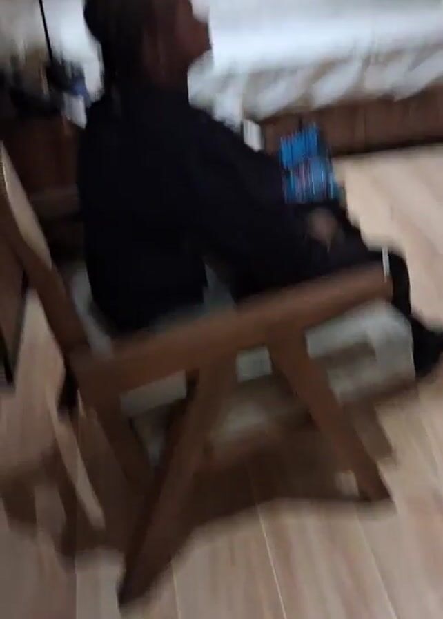 person sitting in a chair using a mobile phone, followed by a room scan showing a bed, a wooden shelf, a television, and a mirror. There is another person sitting on the bed in the background. The floor is made of light-colored wood-like tiles.