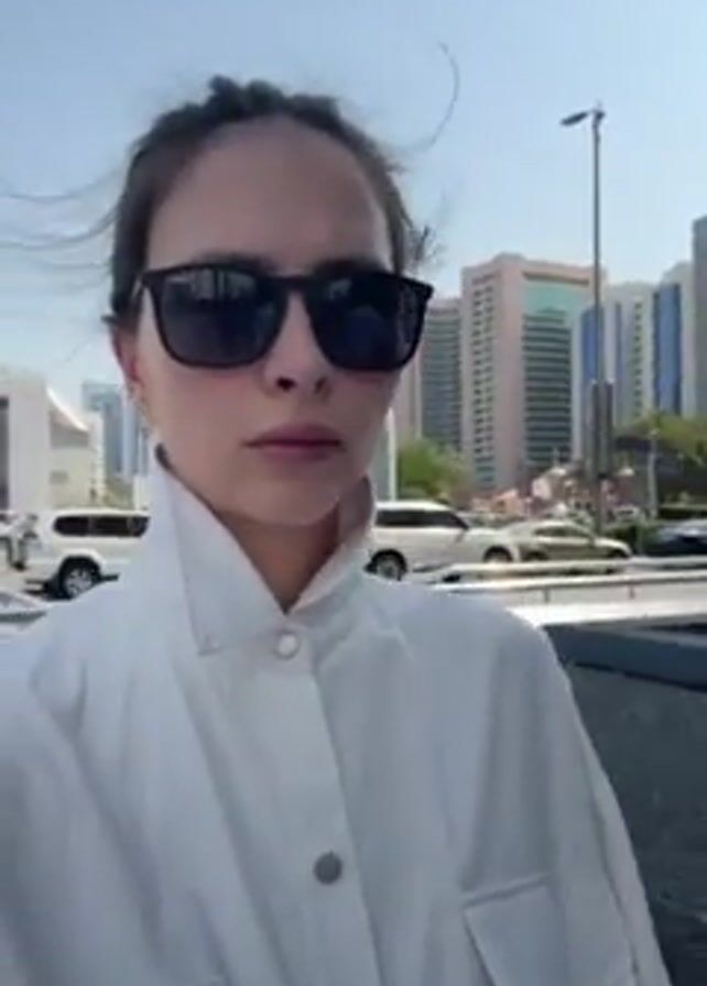 A woman with dark sunglasses and a white shirt is holding a camera looking upwards. The background shows tall buildings and a white-domed mosque. The sky is blue. The woman is walking.