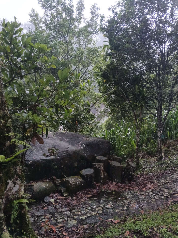 Lush vegetation fills a landscape with trees, ferns, and leafy plants. A large gray rock sits prominently in the scene, accompanied by cut tree stumps. Wet leaves litter the ground, which appears to be a mix of stone and dirt. Foggy conditions obscure the background. Tall green stalks of corn grow near the edge of the scene.
