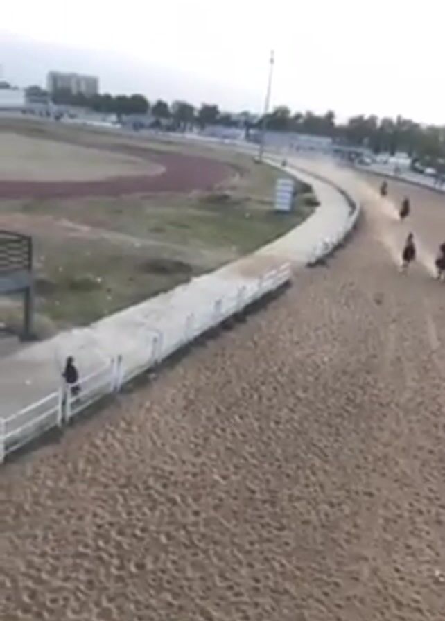 view of a horse racing track from an elevated position, likely a building or stand. There are several horses with riders practicing or racing on the dirt track. The track is bordered by a concrete barrier with a white fence. To the left of the track is a grass area with a running track. In the background, there are buildings and a somewhat overcast sky. A person is seen walking along the concrete barrier. The camera appears to be held by someone who is moving, slightly shifting the perspective during the video.
