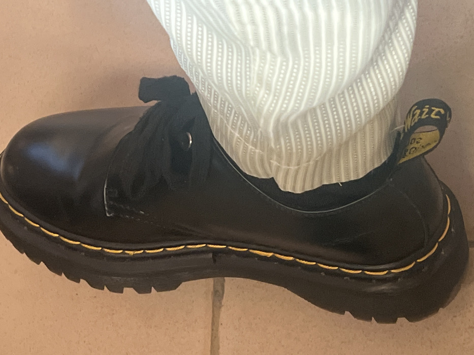 The image displays a single black lace-up shoe, oriented vertically, with its toe pointing towards the top of the frame. The shoe features a thick, black, lugged rubber sole with prominent yellow stitching around its perimeter, connecting the upper to the sole. Black laces are visible across the top of the shoe, forming a loose knot. A yellow fabric tag with black lettering, partially obscured but resembling "AirWair," is attached to the rear upper edge of the shoe. A light-colored garment, possibly pants or a skirt, with a fine horizontal ridged or striped pattern, extends from the upper right, partially covering the ankle area of the shoe. The shoe rests on a floor composed of light brown or terracotta-colored tiles, with visible grout lines indicating individual rectangular tiles. No distinguishing features are present to identify a specific location within Abuja, Nigeria.
