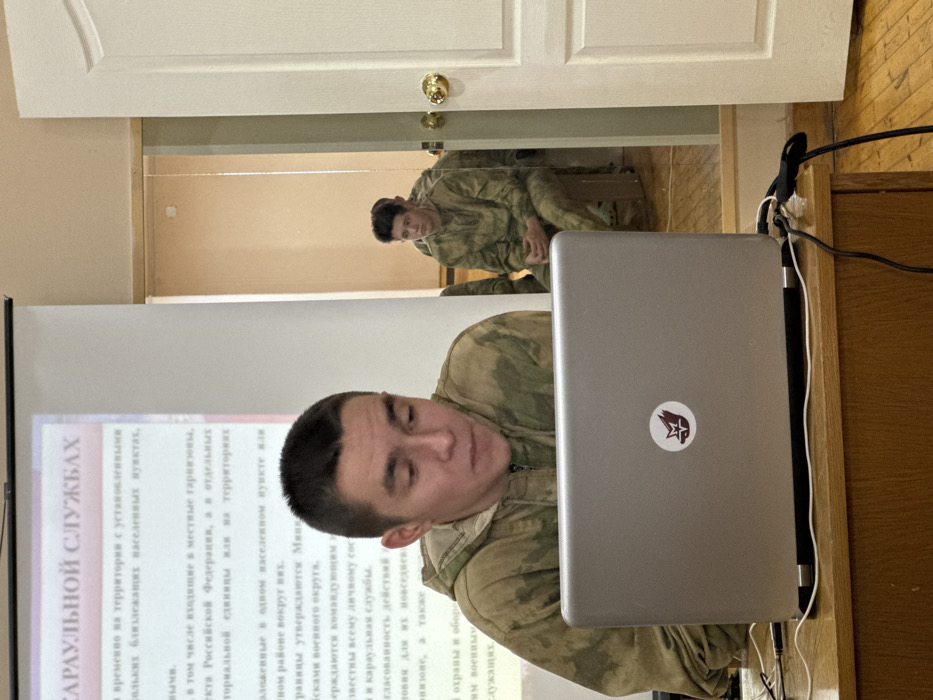 An indoor scene in a training or briefing room in Markovskii, Russia, shows a male individual, likely a young adult, with short dark hair, wearing a camouflage-patterned hooded jacket. He is seated at a light brown wooden desk, looking down at an open silver laptop. A circular sticker featuring a red and black star design is affixed to the laptop lid. Black and white cables are visible on the desk, connected to the laptop. In the upper left background, a white projection screen displays Russian text, with the words "КАРАУЛЬНОЙ СЛУЖБАХ" (GUARD SERVICES) clearly visible, indicating a military or security-related instructional context. On the right side of the image, a large mirror or reflective surface reflects another male individual, also a young adult, wearing a camouflage uniform, seated on a makeshift wooden stool or crate. He has dark, wavy hair and his hands are clasped in front of him. A white door with a brass-colored doorknob is partially visible on the far right, and a light brown wooden floor is reflected below. The overall environment suggests a functional military or paramilitary educational setting.