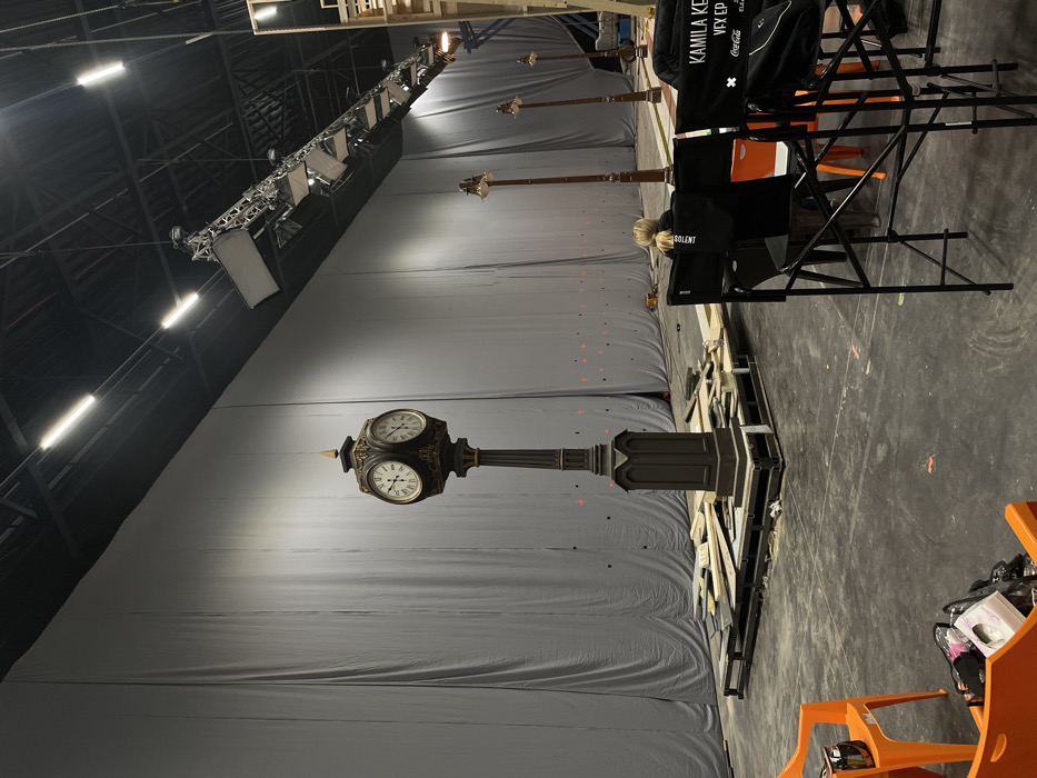 This image depicts an interior scene within a large production studio, located in Bozhurishte, Bulgaria. The central focus is a tall, ornate, freestanding street clock prop, dark in color with gold accents and four clock faces displaying Roman numerals, positioned on a low, dark platform surrounded by scattered wood pieces and construction debris. To the right of the clock, a linear arrangement of three additional street lamp props, matching the clock's aesthetic, extends into the background on a lighter-colored ground covering. In the mid-ground, several black director's chairs are arranged, one bearing "KAMILA KE" and "VFX EP" branding. A person with blonde hair styled in a ponytail is seated, facing away from the camera towards the clock and back wall. Two orange plastic chairs are visible in the foreground, one containing a small black bag and a white tissue box. The studio environment features a vast light-grey fabric backdrop draped along the entire visible back and left walls, marked with scattered orange-red reference dots. The ceiling is black, revealing structural elements and a suspended truss system supporting professional studio lighting equipment, including softboxes and LED panels, along with fluorescent tube lights. The floor is a dark, industrial-type surface.