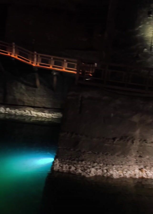 The video depicts an underground chamber, possibly a salt mine, with a pool of water illuminated by a green light
