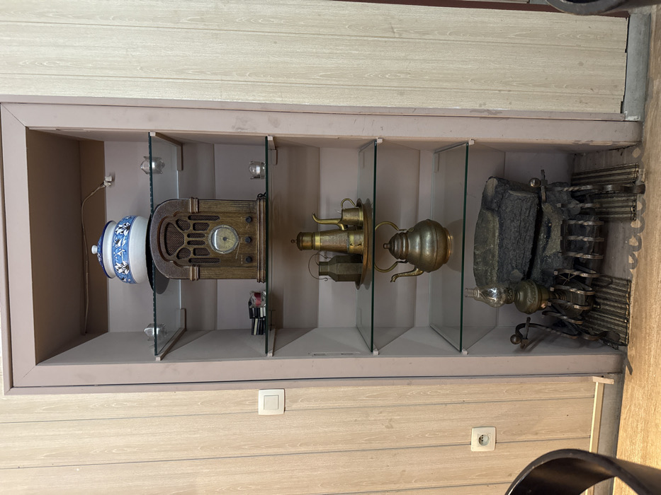 A vertical recessed display niche, approximately 2 meters tall, is centered in a room identified as being in Hasselt, Belgium. The niche is framed by a light tan border and has a matching tan interior back and sides. Five clear glass shelves are uniformly spaced within the niche. **Contents of the Niche (from top to bottom):** * **Top shelf:** A white ceramic lidded pot, decorated with blue floral patterns, rests on a dark circular mat. A thin white electrical cord or string extends from the upper right interior wall towards the pot. * **Second shelf:** An antique-style wooden radio, featuring a central circular dial and a gridded speaker cover, is positioned centrally. To its left, a small stack of black rectangular objects (possibly CDs or cassette tapes) is visible. A small clear glass votive candle holder is on the right. * **Third shelf:** A brass tray holds a collection of three brass vessels: two tall, slender pitchers/ewers (one with a handle), and a smaller brass cup. * **Fourth shelf:** A rounded, polished brass teapot or kettle with a handle and lid. * **Bottom section:** An ornate brass oil lamp with a glass chimney stands on the left. To its right, a metal grate containing two dark, textured faux logs (designed to resemble burned wood) is visible. The grate itself features twisted metal elements. **Surrounding Environment:** The walls flanking the niche are covered with light-colored wood-paneled wallpaper or cladding, exhibiting vertical grooves. On the left wall, a white electrical light switch is positioned at mid-height, and a white European-style electrical outlet is located closer to the floor. The floor is covered with light-colored wooden planks. A portion of a dark, curved chair back is visible in the bottom-left corner of the image. No people, actions, or direct interactions are visible.