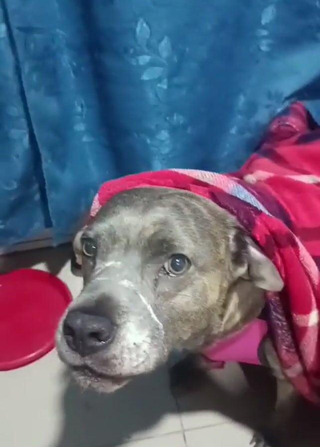 dog with a red plaid blanket draped over its head and back. The dog is mostly gray with black stripes and some white markings on its face. It has a pink collar or harness around its neck. A red disc or plate is visible near the dog on the floor. The background consists of a teal curtain with a floral pattern. The dog is making a whimpering or whining sound.