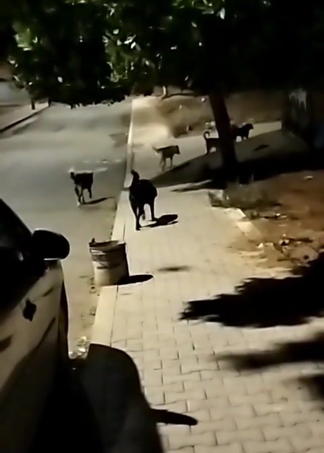 A dimly lit, low-resolution video shows a street scene at night. Several dogs are visible on a sidewalk and in the street. A car is parked on the left side of the frame, partially obscuring the view. There is a tree with dense foliage overhead, casting shadows on the ground. A garbage bin is visible near the sidewalk. The street is paved and illuminated by distant streetlights. The general atmosphere suggests a residential area. The dogs appear to be moving freely around the street and sidewalk.