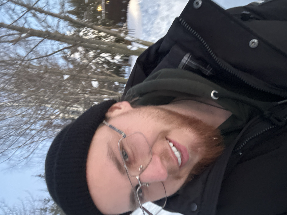 A fair-skinned man with red hair and a trimmed beard smiles at the camera. He is wearing glasses and a black beanie. His attire includes a dark green hoodie under a black winter coat. The background shows a snowy outdoor scene with bare tree branches and a building in the distance. The image is rotated, presenting the subject at an angle.