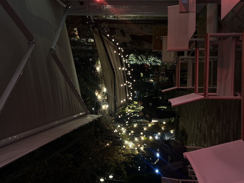 An outdoor dining area at night, illuminated by numerous string lights. Tables and chairs are visible, along with an awning partially covering the space. Two dark figures stand amongst the lights. The overall mood is warm and inviting, despite the darkness.