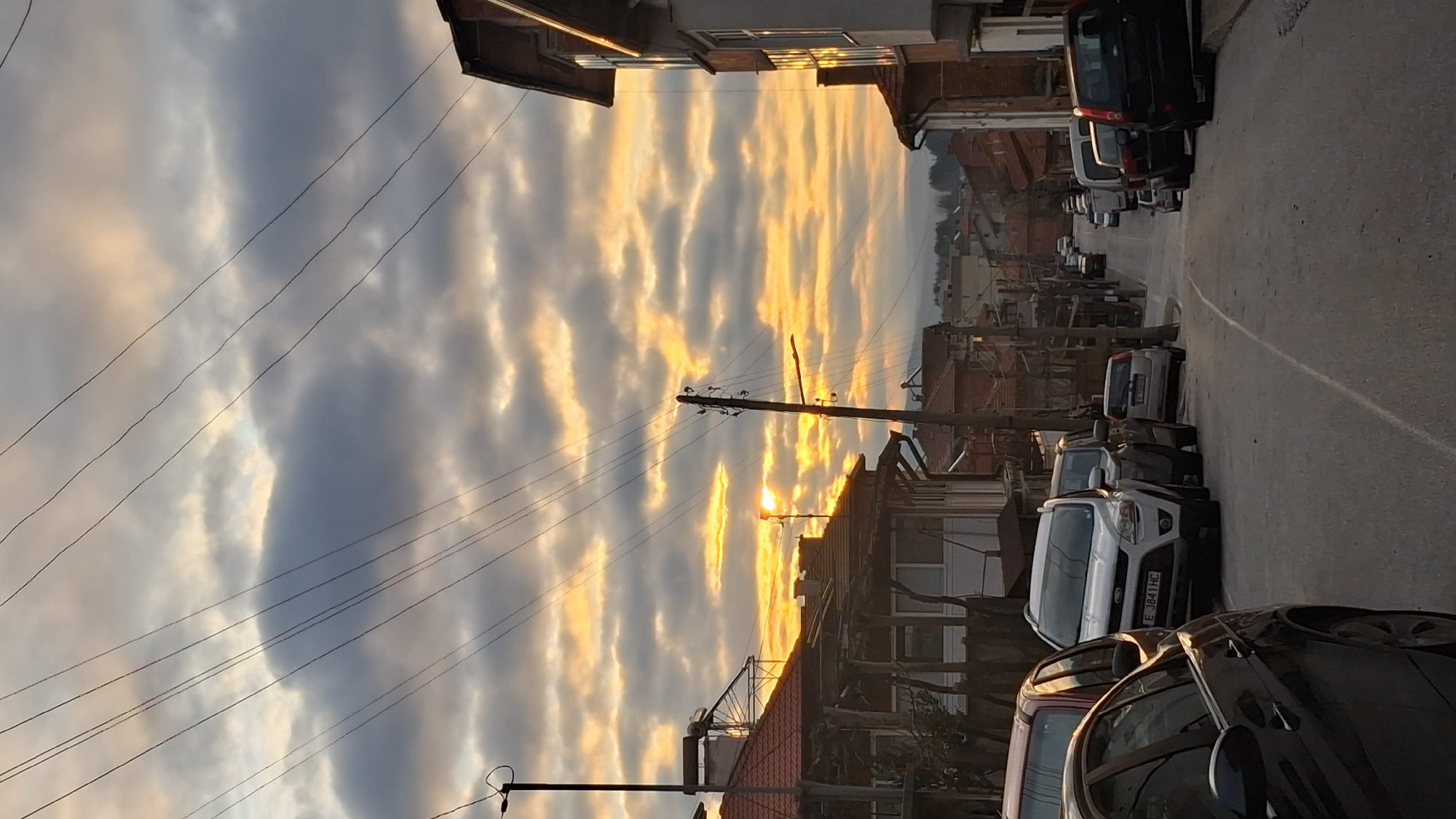 street scene in Goce Delcev, Bulgaria. The road extends into the distance, lined with parked cars on the right. Buildings are visible on both sides of the street. A dramatic sky with clouds illuminated by the setting sun is above the buildings. Telephone poles and wires are prominent in the foreground.