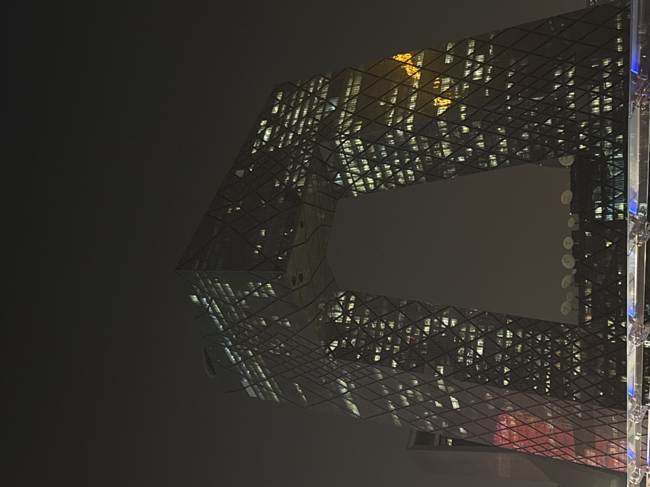 The image displays the illuminated CCTV Headquarters building at night in Chaoyang District, Beijing, China