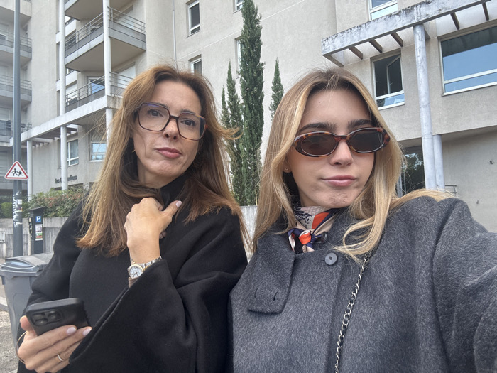 The image depicts two women posing for a selfie in an outdoor urban setting in Villeurbanne, France