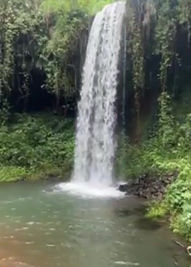 moderately sized waterfall cascading into a clear pool of water. Lush green vegetation, including trees and smaller plants, surrounds the waterfall and pool, suggesting a tropical or subtropical environment. The lighting appears overcast, with a soft, diffused light illuminating the scene. There is no visible human activity in the foreground, allowing the focus to remain on the natural beauty of the waterfall and its environment.