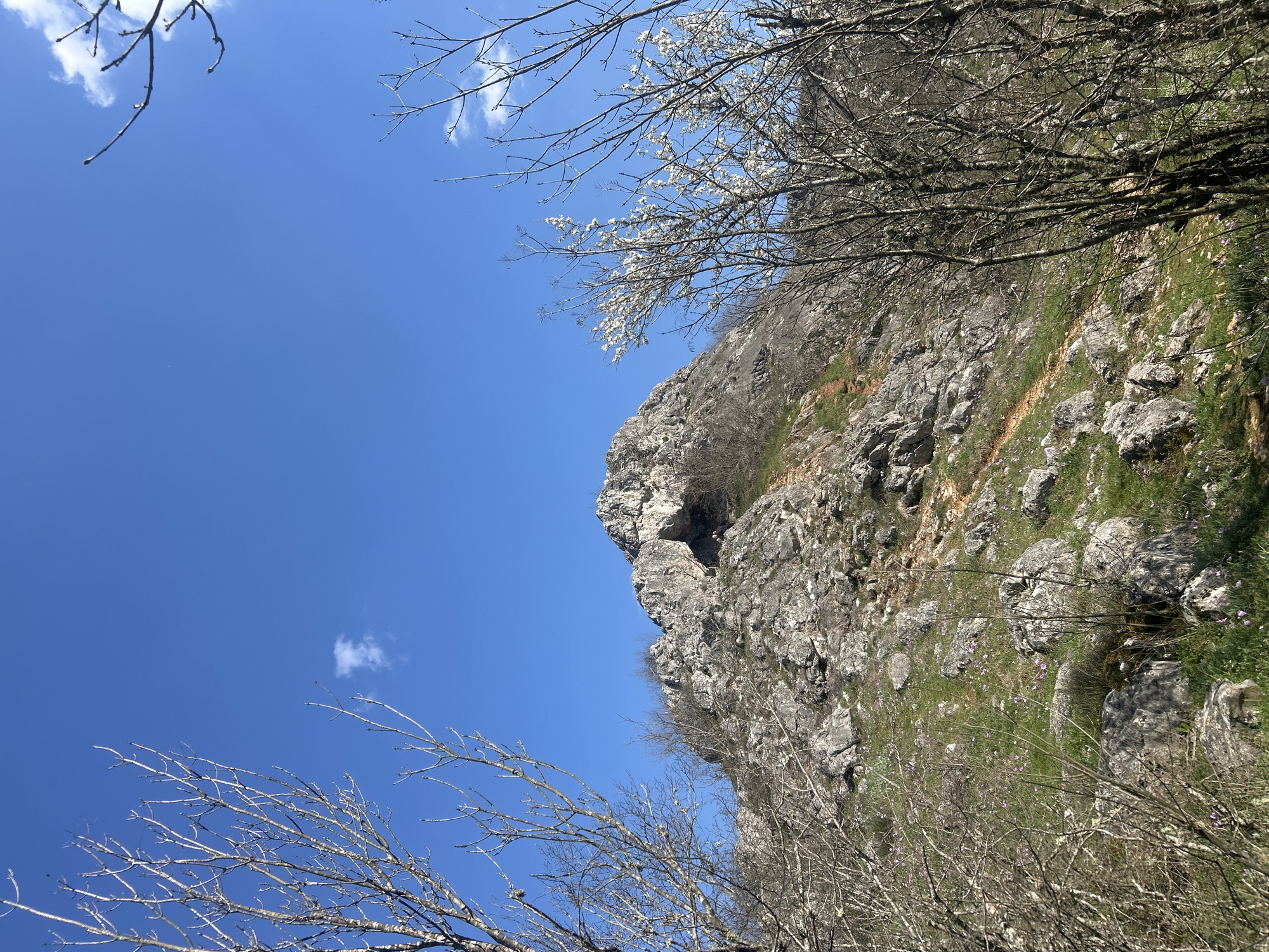 rocky cliff face in Mladezhko, Bulgaria, under a clear blue sky with sparse clouds. The cliff is covered in grey rocks and patches of green grass and vegetation. Bare tree branches are visible at the bottom and top edges of the frame, some with white blossoms. There are no people visible.