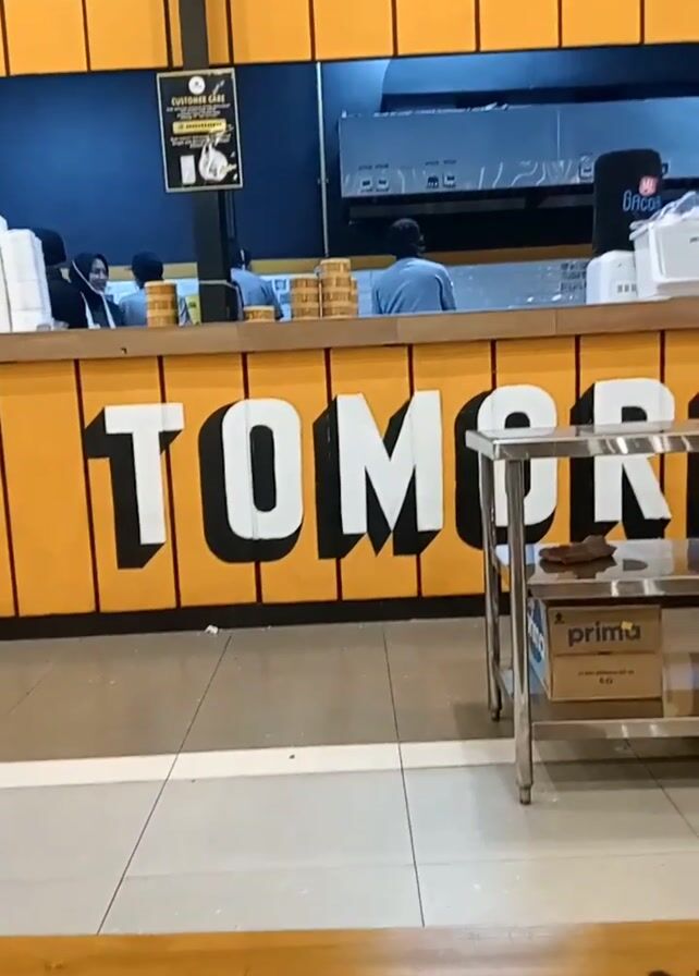 The camera pans up to show a restaurant counter with a yellow front panel and white lettering that says "ITS TOMORROW"