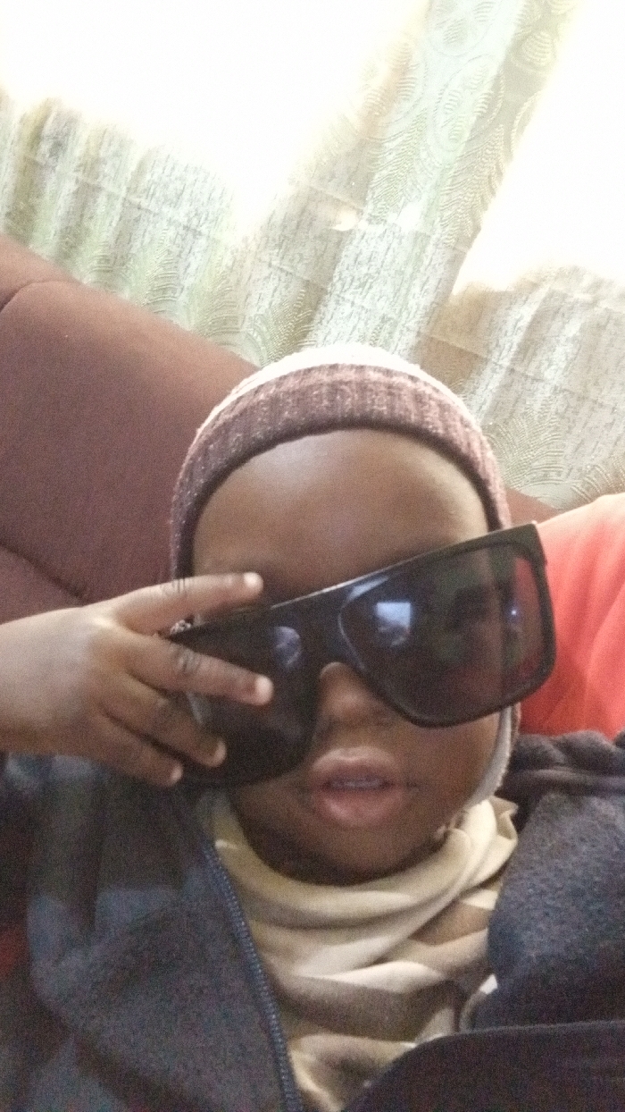 A young individual, appearing to be a child, is depicted in a close-up, chest-up view, located within Unguwan Dosa, Nigeria. The subject has dark skin and is wearing a brown and beige striped knitted beanie, large dark rectangular sunglasses that obscure the eyes, a light beige high-necked shirt, and a dark zippered jacket. The right hand is raised, with fingers resting on the upper right frame of the sunglasses. The subject's mouth is slightly ajar. The background consists of a reddish-brown upholstered surface to the left, and a light-colored, possibly pale green or off-white, patterned fabric, likely a curtain or textile, visible to the upper right. A flash of reddish-orange is also visible behind the subject's right shoulder. The subject appears to be seated or reclining indoors.