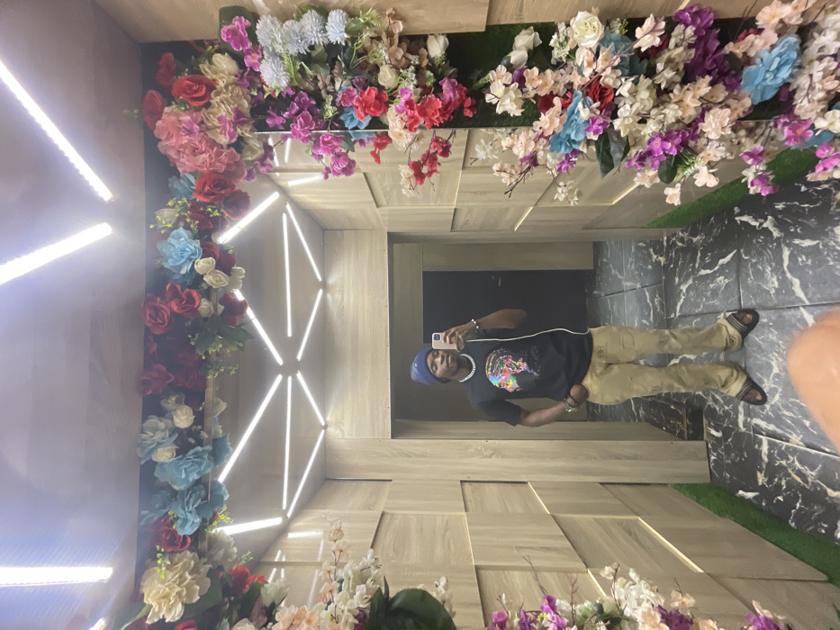 A man stands in an elevator decorated with flowers around the perimeter and geometric lighting on the back wall. He's taking a selfie with his phone. He wears a black t-shirt, khaki pants, a blue hat, and sandals. The elevator's floor is dark marble, and there is artificial grass along the sides. The walls are paneled with light wood, creating a modern, stylish atmosphere.