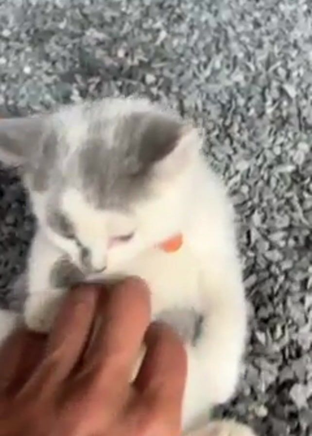A hand rubs the belly of a kitten lying on its back on a bed of gray gravel. The kitten is white with gray markings and is wearing an orange collar. The kitten opens its mouth and meows at the camera as the hand rubs its belly.