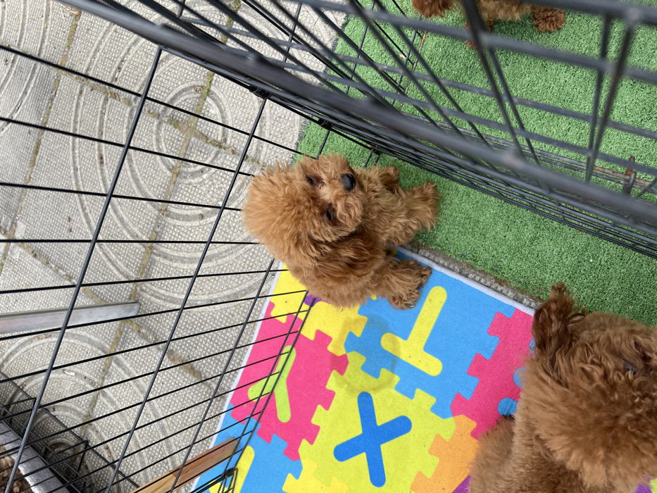 - "The image depicts three reddish-brown canids, consistent with toy poodle puppies, contained within a black wire metal playpen in an outdoor setting" by FM-SLV922, licensed under CC BY 4.0