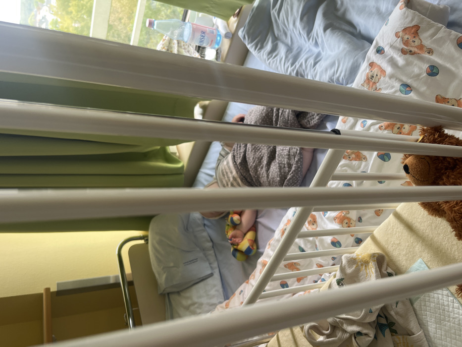 The image depicts a child sleeping in a hospital room in Bad Kreuznach, Germany